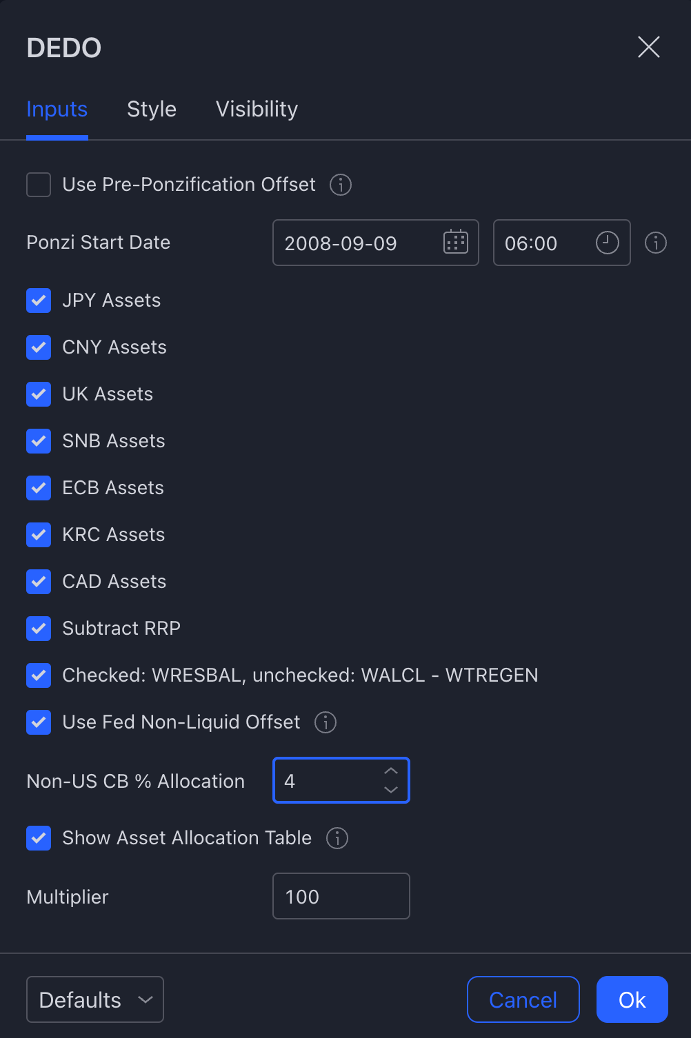 Pre-ponzification offset allows the user to subtract the asset price on a specific date, such as the default which is when QE started to remove valuation pre-QE.