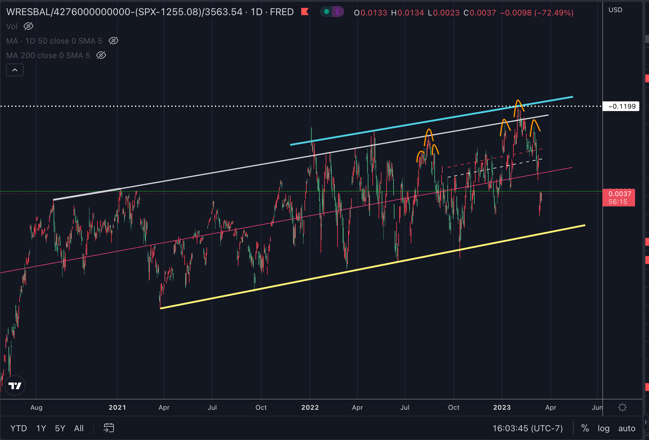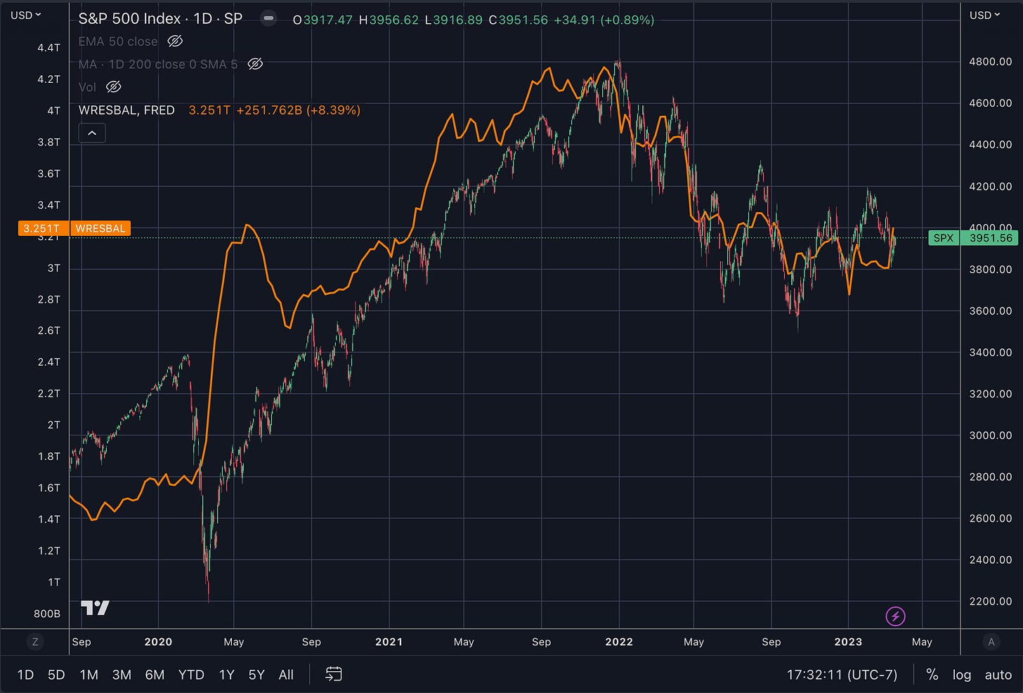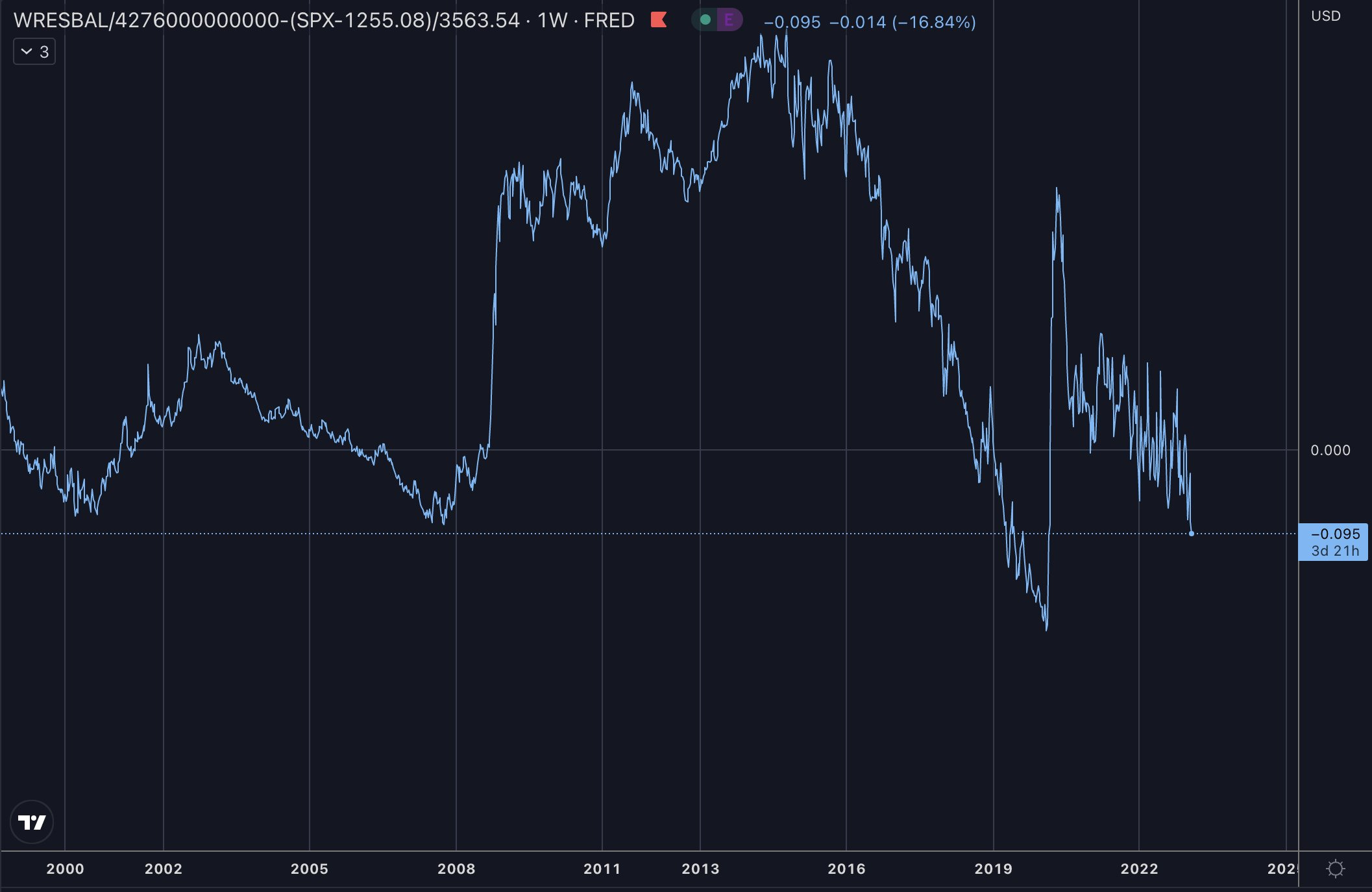 FRED:WRESBAL/4276000000000-(SP:SPX-1255.08)/3563.54WRESBAL is a Fed balance sheet data set that can be viewed on the FRED website. For anyone interested in diving deeping into WRESBAL, see my explainer which dissects the individual components.