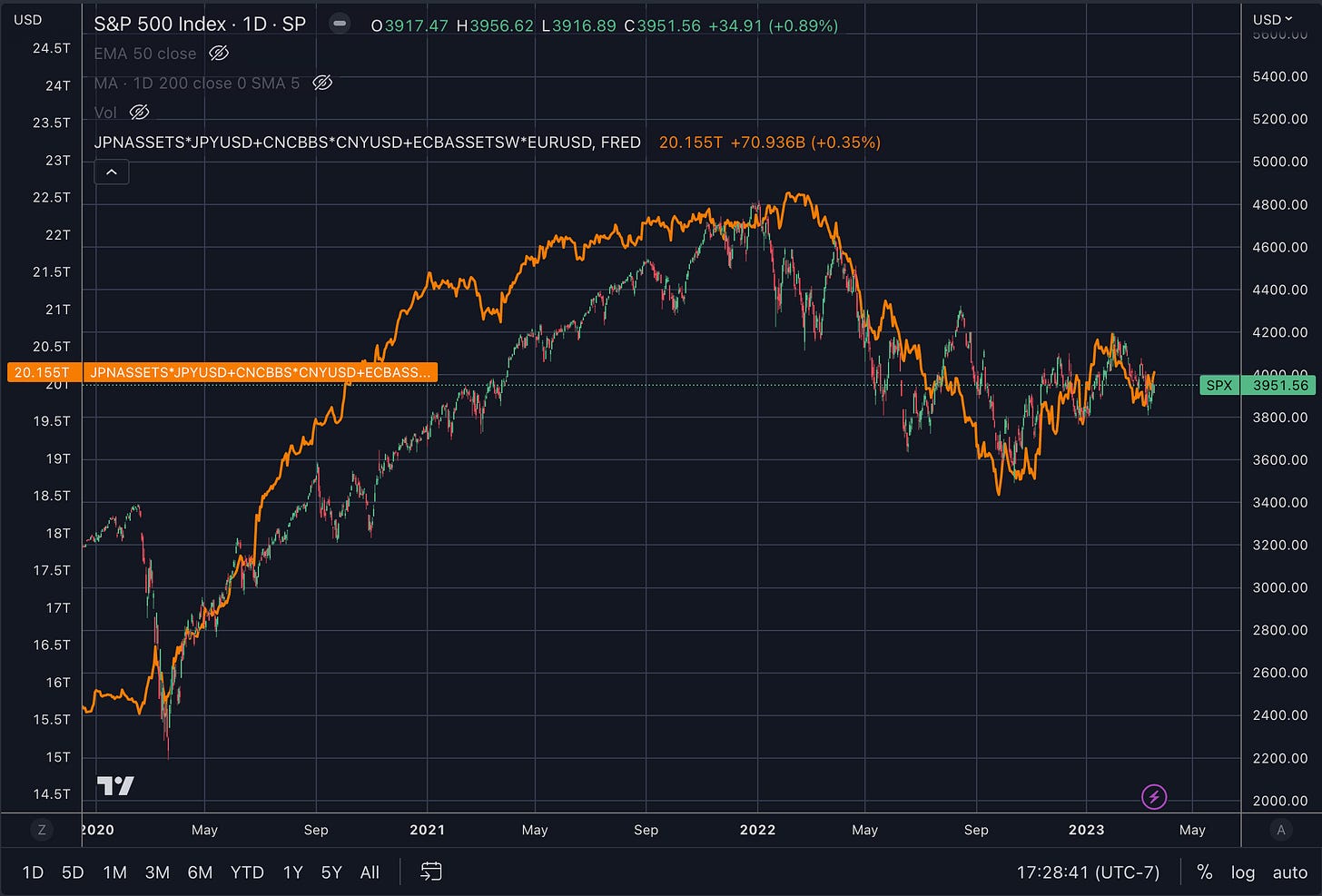 FRED:JPNASSETS*FX_IDC:JPYUSD+ECONOMICS:CNCBBS*FX_IDC:CNYUSD+FRED:ECBASSETSW*FX:EURUSDThis is not a DEDO chart, but it shows that a few central bank assets can pretty closely resemble the SPX chart.