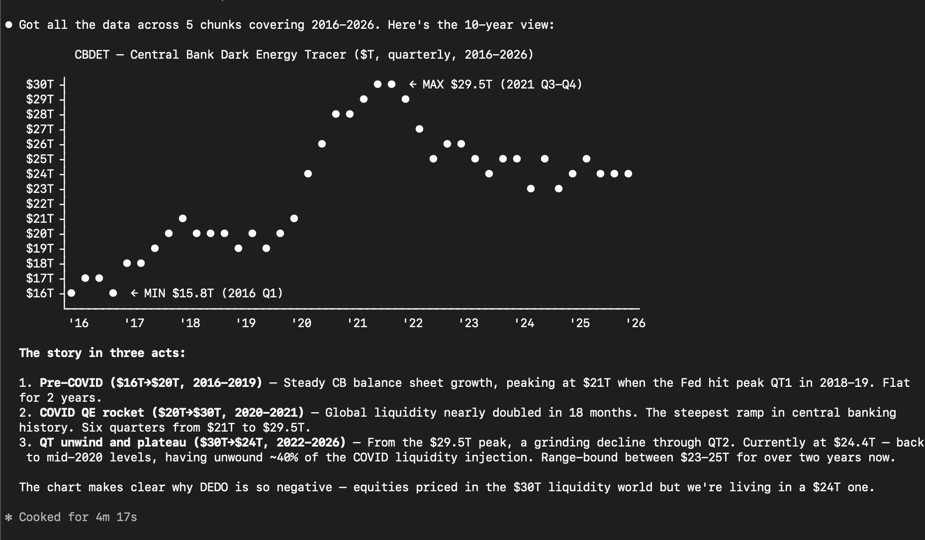 With Darkly Energized MCP configured the /mcp directive is all it takes for Claude to look in the toolbox for the service that knows about CBDET, and off it goes hunting for the data, and preparing the ASCII chart right there in the CLI. I didn’t even ask for the “story in three acts”…it added that analysis on its own.