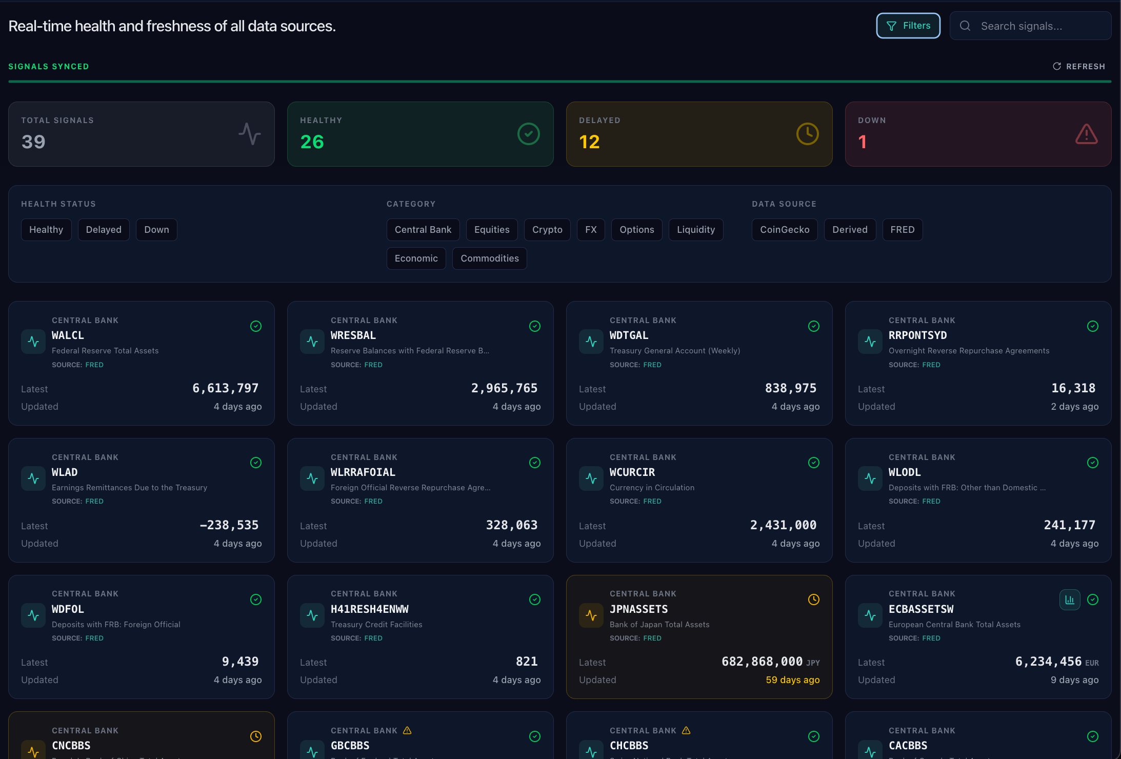 The signal health is scored based on a pre-determined freshness factor tailored to the frequency of the data stream. Central bank data is infrequent, and often delayed, which you can see here in some of the cards.