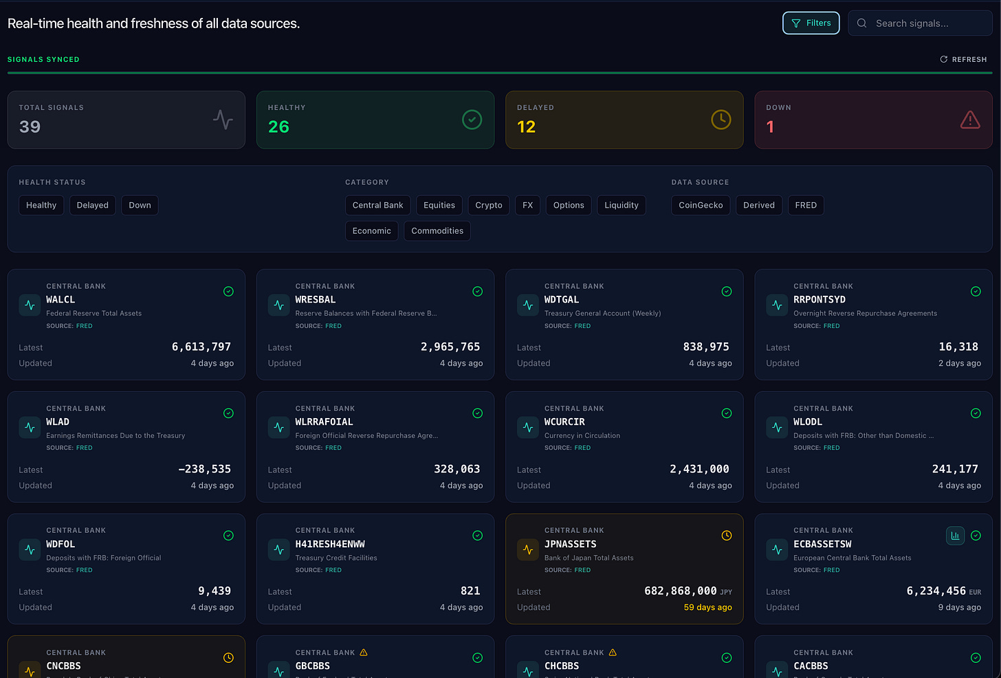 For full transparency and attribution, I am including information about every single data stream on a signal status page. The page will load all data streams, and provide a card for each explaining what it is, providing info about the data source. There is filtering to focus on specific types such as crypto, FX, liquidity, etc.