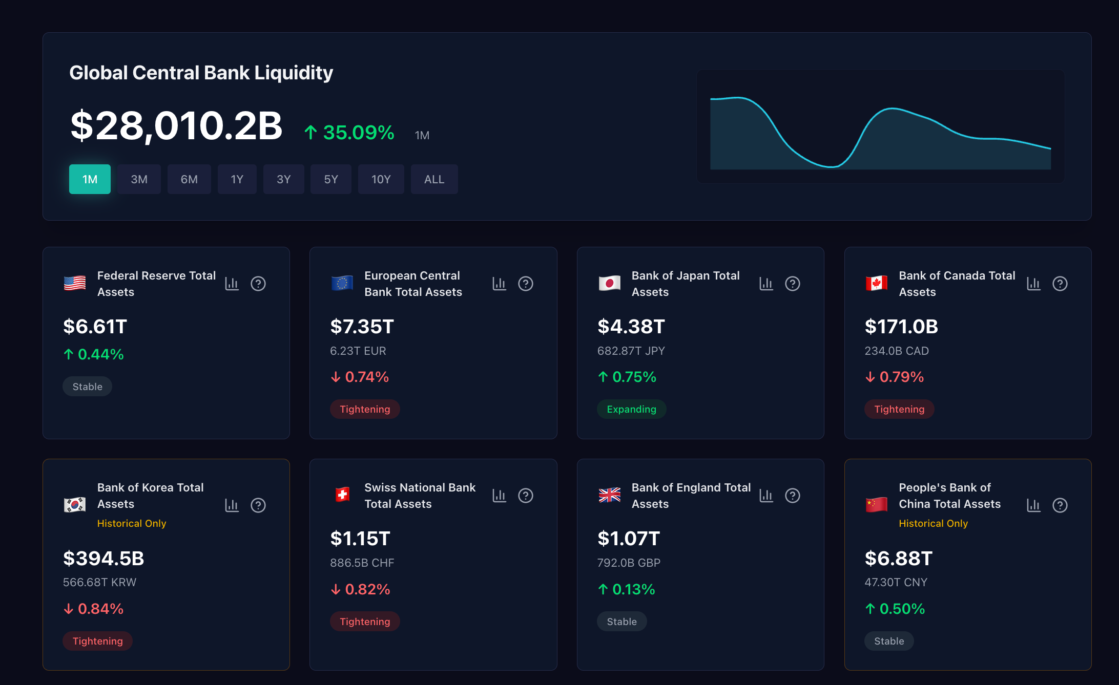 The DE app comes free with data from BIS, FRED, and others (attribution included in app), and the UI has a few modes of viewing the data. First, there is a dedicated “Central Banks” page including a tiled collection view of all balance sheets: