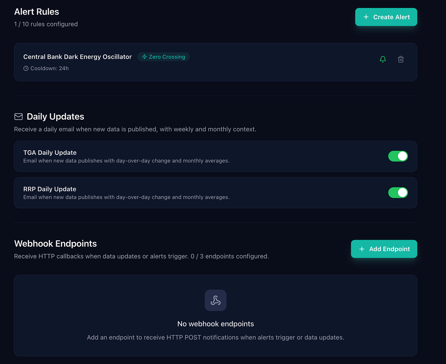 For those that have followed me on X to get daily TGA and RRP updates, this feature is for you…or maybe it’s for me so I can automate those updates on X. Either way, enjoy updates on the latest TGA and RRP (and other) data within minutes of the data drop on the official API sources (FRED and Treasury.gov). Darklyenergized.com has a data sync engine that will trigger automated updates so that you get notified quickly as the liquidity landscape evolves.